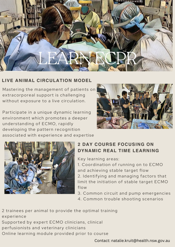 For inexperienced providers, getting exposure to circulations supported with extracorporeal support can be challenging and is one of the biggest deficiencies seen in training courses. In developing the training program for novice providers performing pre-hospital ECPR, we developed a porcine model of training to facilitate exposure to the haemodynamic abnormalities that can occur with extracorporeal support. By the end of the course, participants will be able to: