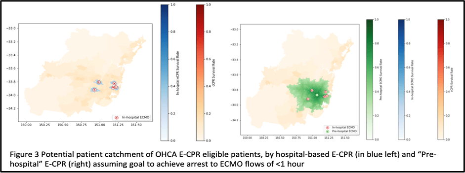 The 60-minute cut off reduces the geographical area and population that can be covered by hospital based ECPR. There is currently only a relatively small area of metropolitan Sydney hospitals (Figure 1) where patients can reasonably be expected to arrive within the time cut offs. Many other patients who meet ECPR criteria outside of this area are ineligible, worsening inequality of healthcare access.
